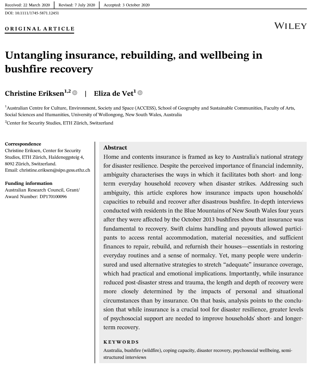 I am delighted to announce that Eliza de Vet and I have been awarded the Wiley Prize 2021 by the Institute of Australian Geographers and Wiley Publishers for our article ‘Untangling insurance, rebuilding, and wellbeing in bushfire recovery’, published in the journal Geographical Research in November 2020.