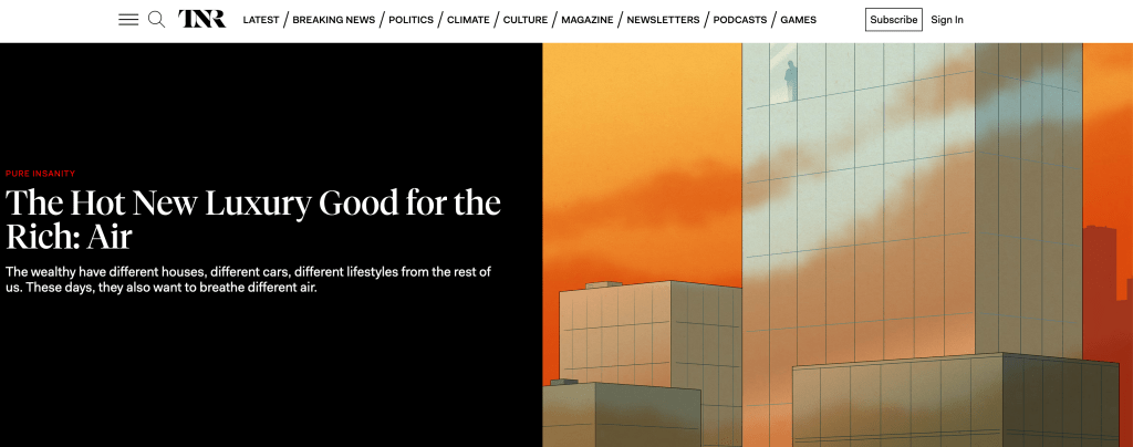 As weeks or months of chronic smoke conditions caused by wildfires impede “business as usual”, the quest to secure clean air has – in and of itself – become a business. Late last year, science journalist Shayla Love interviewed me for an article in The New Republic about The Hot New Luxury Good for the Rich: Air. We discussed the varied ways inequity is perpetuated when clean air is treated as a commodity, as well as the immense potential technological innovation holds if it drives social betterment, not just luxury goods.