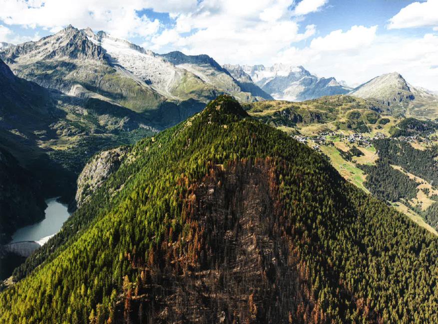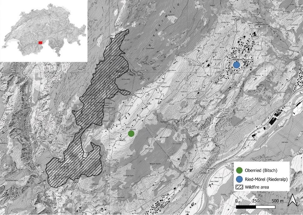 The Canton of Valais has a history of disastrous avalanches, landslides, debris flows, floods and increasingly also wildfires. The Riederhorn wildfire is the third wildfire since 2000 that has threatened communities. In 2003, a wildfire in Leuk damaged 300 ha of forest, including 70 ha of protective forest, as well as a small chalet and a vineyard cottage. In 2011, a wildfire in Visp damaged 110 ha of protective forest. The Riederhorn wildfire started on 17 July 2023 and spread rapidly due to dry conditions and strong winds. It led to the evacuation of circa 200 residents from Oberried and Ried-Mörel. Hundreds of firefighters from Valais and other cantons, as well as members of the civil protection services were deployed. It took more than three weeks to fully extinguish the wildfire due to the challenging mountainous terrain and weather conditions. The wildfire damaged about 185 ha of protective forest, which increases the risk of subsequent gravitational hazards.