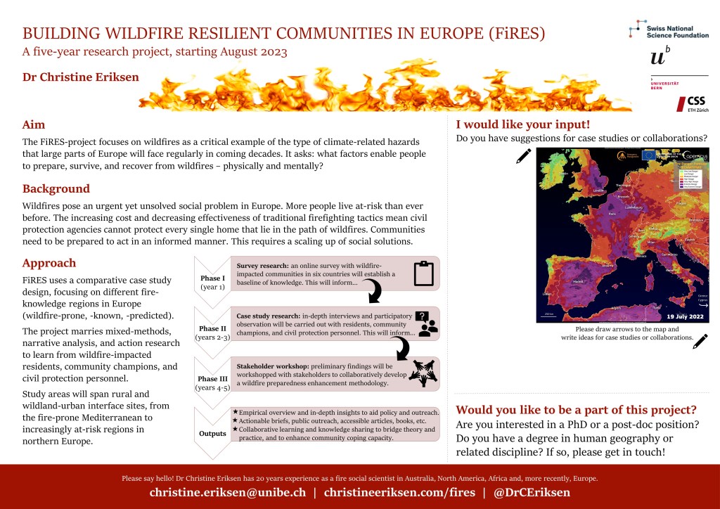Wildfires pose an urgent yet unsolved social problem in Europe with more people living at-risk than ever before. This is due to a four-decade increase in the frequency, scale, and intensity of wildfires in southern, central, and northern Europe alike. Communities therefore need to be better prepared to act in an informed manner, and this requires a scaling up of social solutions. Since August 2023, Dr. Christine Eriksen has led FiRES – a five-year project funded by the Swiss National Science Foundation to study wildfires resilience among at-risk communities in Europe. After an initial two years at University of Bern, the project is now hosted by ETH Zürich.